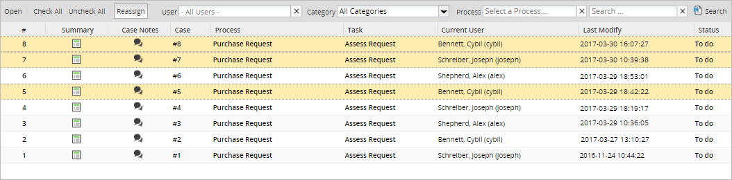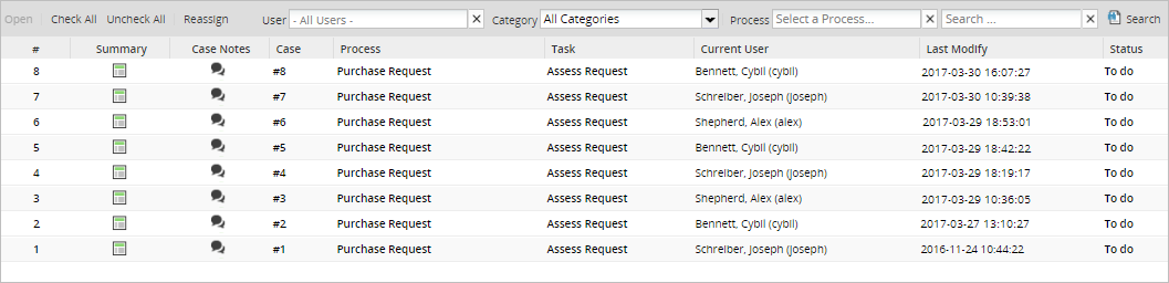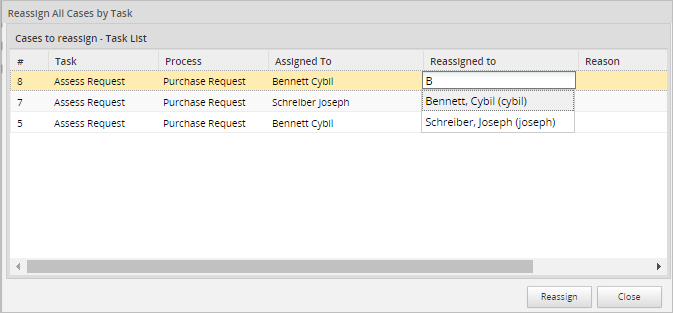 To reassign a case, select the case from the list and double-click on the Reassign to column. A user list displays. Choose the user who will have the authority to work on the case after it is reassigned. Remember that process supervisors, users assigned to a case, or ad hoc users are listed in the search option when reassigning a case.