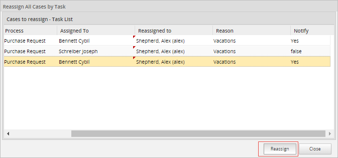 Select a case from the list and click the Reassign button. To select more than one case, press the SHIFT and the UP or DOWN key to select cases that are contiguous, or hold the CTRL key and select each case to select multiple cases that are anywhere on the case list.