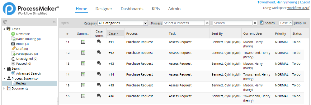 All the cases with To Do status of the supervised process will be listed in the panel at the right side. Note that cases currently in the initial task as drafts are NOT displayed. Once cases move to the second or subsequent task(s), they are included in the list.