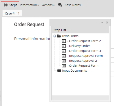 - Steps: Lists all the steps, Dynaforms and input documents made in the process. Only the Dynaforms and input documents that were assigned to the supervisor are listed in the Step List.