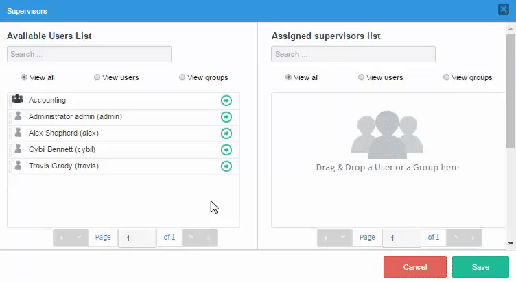 To add a supervisor, click on the green arrow or simply drag and drop the name of the user or group from the Available Users List to the Assigned Supervisors list. To remove an assigned group or user from the supervisor list, click on the x icon at the right side of the name of the user or group, or simply drag and drop the user/group back to the Available users list.