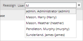 Click the User suggest box and type the name of the user to reassign this case. As you type, the names of the users that match the entered text displays. Choose the name of a user and only the cases that are currently assigned to that user will be filtered.