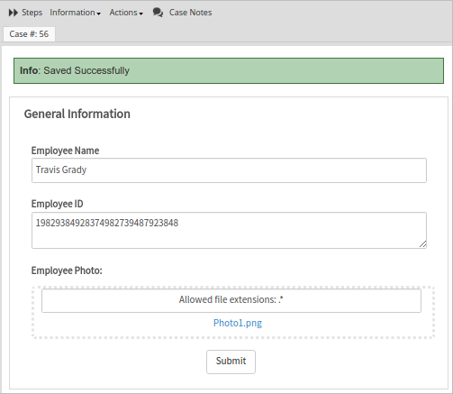 To edit the data in a Dynaform or the list of files in a Input Document, click on it to open it for editing. When done editing a Dynaform's data, click on its submit button to save it and a message will be displayed green that the data has been saved. Note that no Next Step link is available when filling in Dynaforms as the supervisor, so add submit buttons to all Dynaforms whose data needs to be edited by a supervisor.