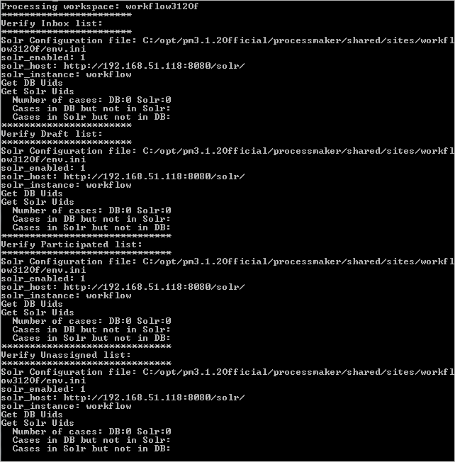 A script was created to compare the cases indexed in the Solr server versus the cases in the ProcessMaker database. In other words, this script compares the cases list in every folder (Inbox, Draft, Participated, Unassigned). The verify_solr.php script is located at: <INSTALL-DIRECTORY>/workflow/engine/bin/