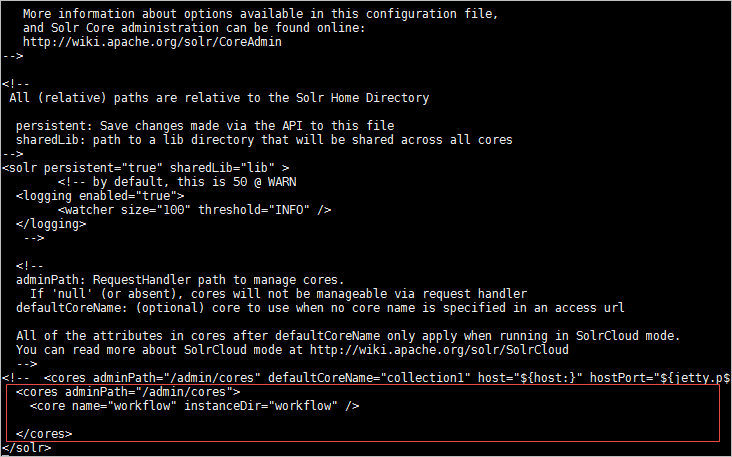 Now, it is necessary to declare the new instance in the Solr Core file: solr.xml. This file has the following content: