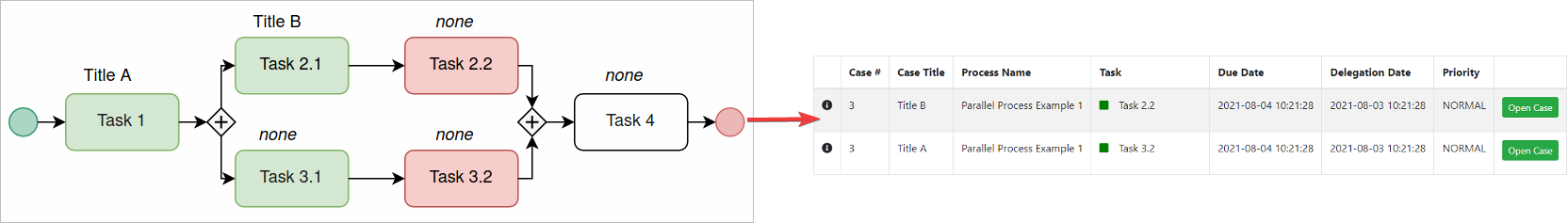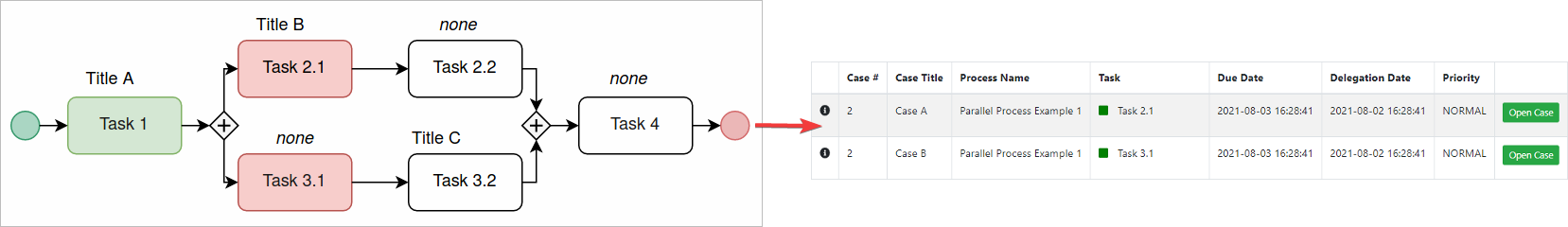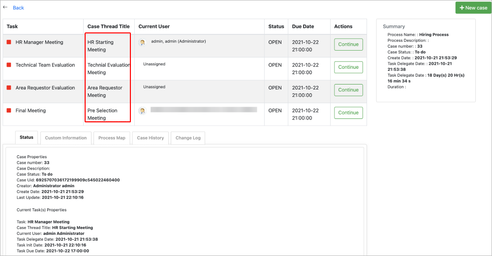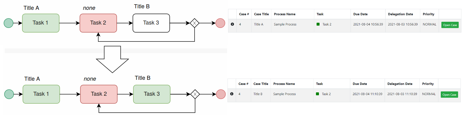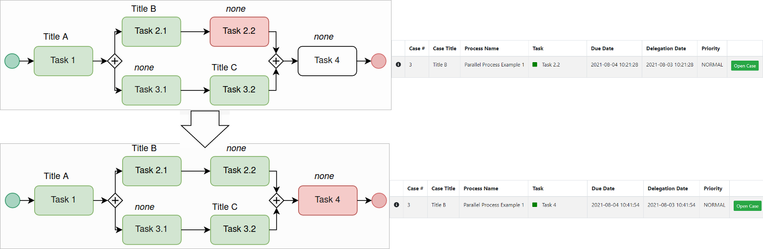 A process architect with proper permissions is able to change the Case Title in parallel tasks. The use of Case Titles strengthens the differentiation of multiple threads in a case list when using Parallel Gateways. Consider that if the case title is not defined, it displays the case title of the previous task. Case Titles also display in a case list to search cases easily. For more information about how to set the Case Titles, please check the section above.