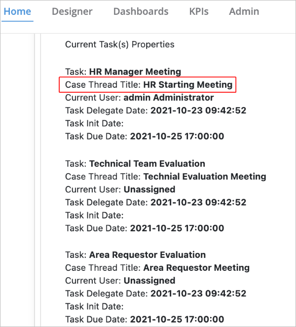 Use the Case Thread Title to register a case label per thread in a case. For example, if you configure three different tasks using parallel routing, you define three threads in a process. As a result, each thread can have its own case label as displayed in the following example.