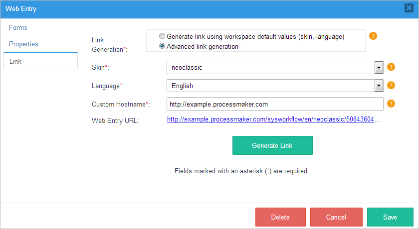 - Web Entry URL: The URL of the Web Entry that is generated when the Generate Link button is clicked.