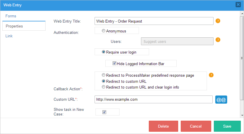 Web Entry allows anonymous, external users to initiate new cases from an external web page where logging into ProcessMaker is optional. Web Entry provides a web link of a Dynaform or Multiple Steps in the first task of a process. The user fills out this Dynaform or Multiple Steps and submits the data back to ProcessMaker. Web Entry can only be used to start cases.