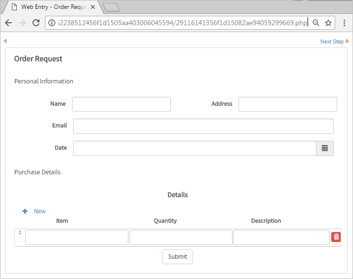 Web Entry provides the "PHP pages with web services" option to generate an external web link to a Dynaform in the initial step of a process. This link can be used in an HTML <a href> tag in an external web page or can be embedded inside an external web page through HTML <frame> or <iframe> tags.