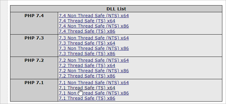 3. Choose the link according to the PHP version on your server and click to download the DLL file.