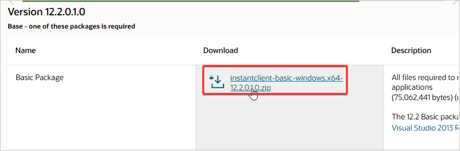 8. Download the package and make sure that the version selected is the same or above than the one shown previously by the SQL Plus.