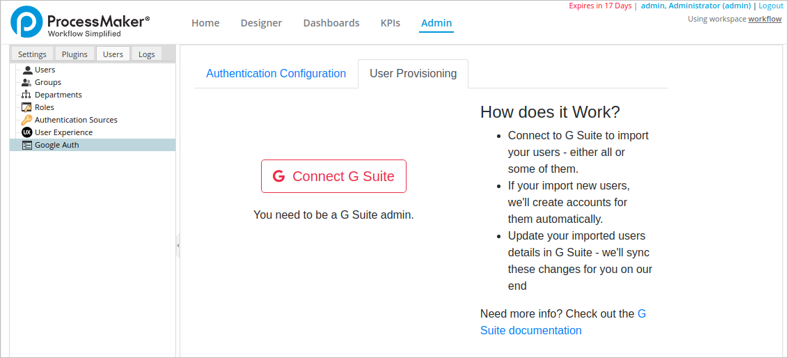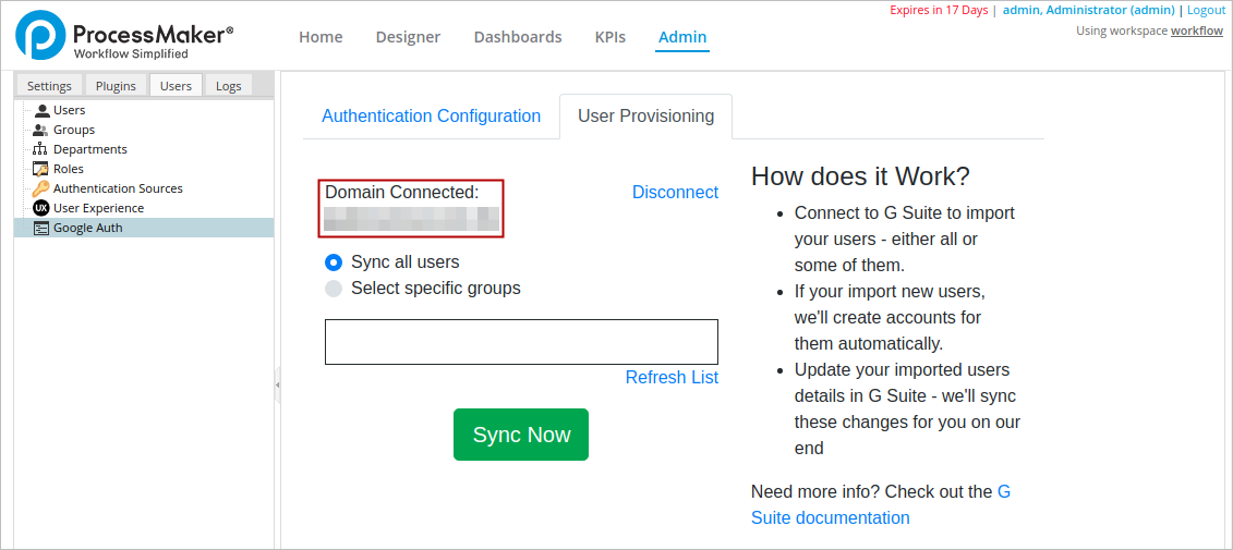 As an administrator, you can import some or all of your organizational users into the plugin so that users you specify can log in to ProcessMaker via their Google credentials.