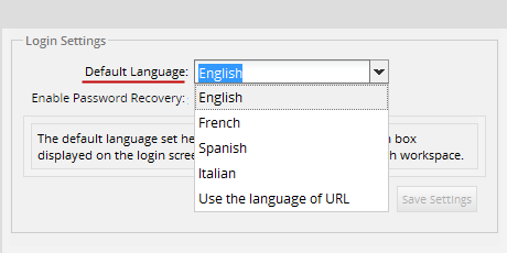Use the Default Language option to select the language by default that displays in the logon screen. ProcessMaker is available by default only in English, but translation files for additional languages can be installed. This configuration must be set for each workspace.