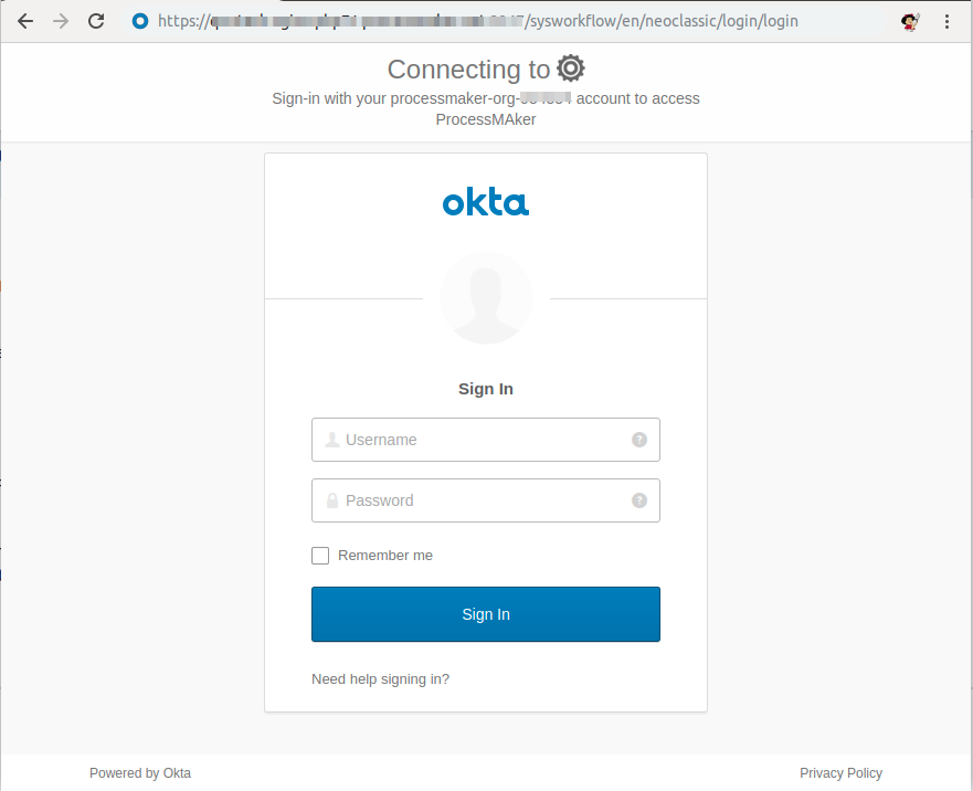 The URL redirects to the IdP service (in this case, Okta). Depending on the Field Matching configuration, the logon screen displays.