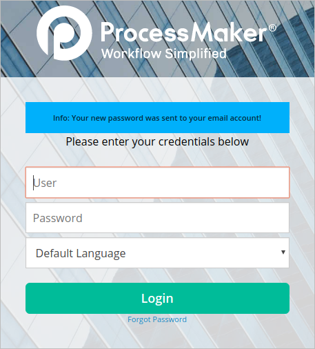 Note: To receive the email sent by the Forgot Password option, first ProcessMaker must be configured to connect to an email server. If it is not, a warning message displays.