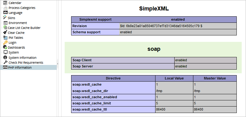 The SOAP library for PHP implements both the SOAP 1.2 and WSDL 1.1 specifications. To use SOAP in a PHP script, PHP should be configured with the option --enable-soap. The ProcessMaker Windows Installer enables this option by default, but it may not be enabled in Linux/UNIX. To verify whether its enabled, go to Admin > Settings > PHP Information:
