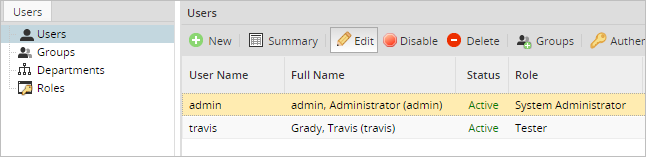 Once under the Users tab, select the user and click on the Edit button. The form used to create the user will open, displaying the user's personal information where the enabled fields (depending on the corresponding permissions assigned to the user’s role) may be edited.