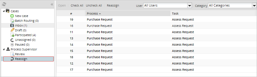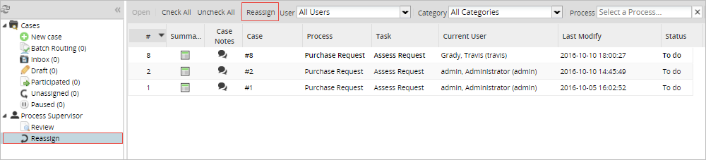 - If a non-supervisor user is assigned with this permission, the user will NOT be able to reassign cases until he/she is marked as a Process Supervisor.