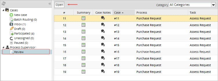 Note: Please take note that if the PM_SUPERVISOR permission is removed from the supervisor user's role, he/she won't be able to access the Review option in the Process Supervisor menu or perform any actions over the cases, even if he/she remains assigned as a user supervisor. Therefore, please remember that if any permission is changed, removed or added to a role, it is necessary to update the process design to fit the newly assigned or removed permissions.