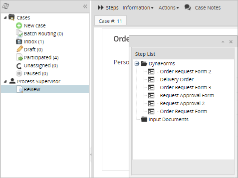 After opening the case, the Dynaforms and Output Documents that can be edited by the Process Supervisor will be available inside the Step List dialog box.