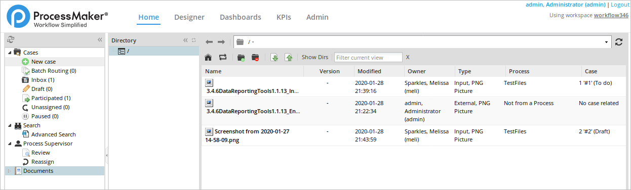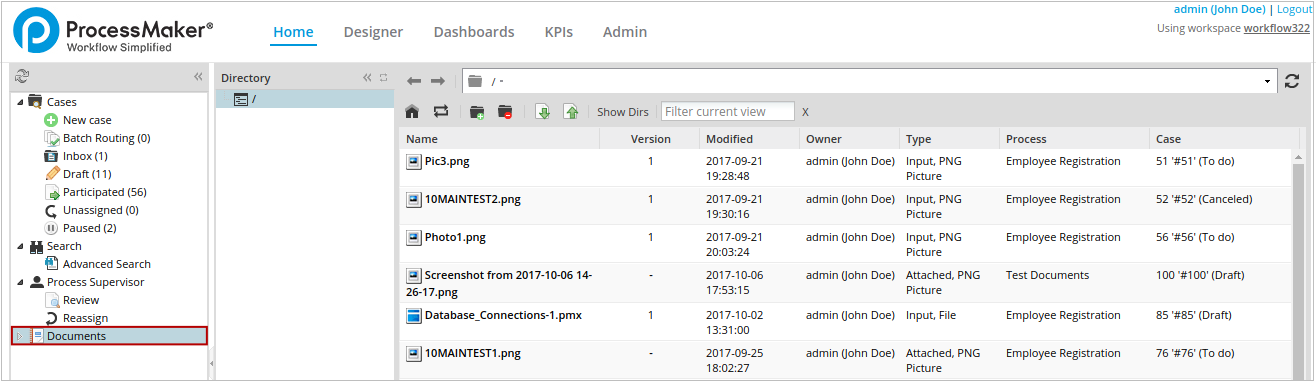 In addition, it provides access to the Documents option, which allows users to view any files that were uploaded (Input Documents and attached files) or generated (Output Documents) while running cases.