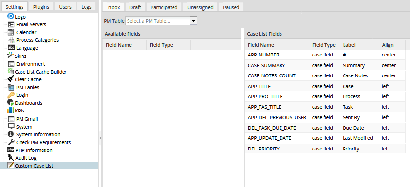 The PM_SETUP_ADVANCE permission provides access to advanced setup options under the Admin menu. Depending on the option, this permision must be accompanied with the PM_SETUP_LOGO to access the Logo option, with the PM_SETUP_PM_TABLES permission to access the PM Tables option, Dashboards, Languages and Cases List Cache Builder options, which are under the Settings tab, the Plugins tab, and the Authentication Sources option under the Users tab.