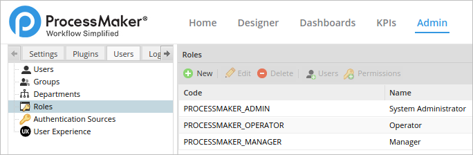 To see the available roles, log in to ProcessMaker with a user such as the "admin" who has the PM_USERS permission in his/her role. Then, go to Admin > Users > Roles and the following list will be displayed: