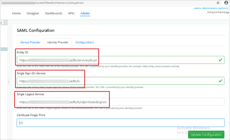 Enter the following information from ADFS to ProcessMaker in the Identity Provider section, then click Update Configuration:
