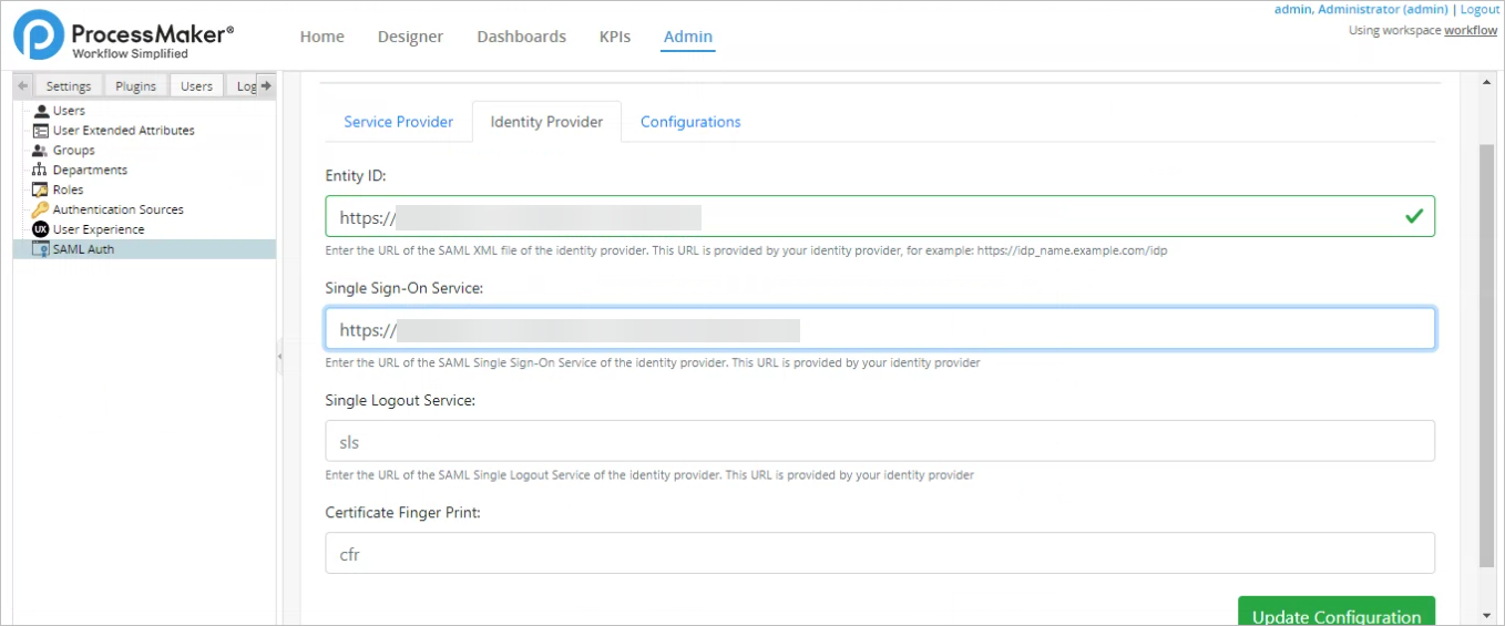 Now SAML configuration is required by ProcessMaker in the Identity Provider section. Copy the following fields from Google G-Suite and then click Update Configuration in ProcessMaker: