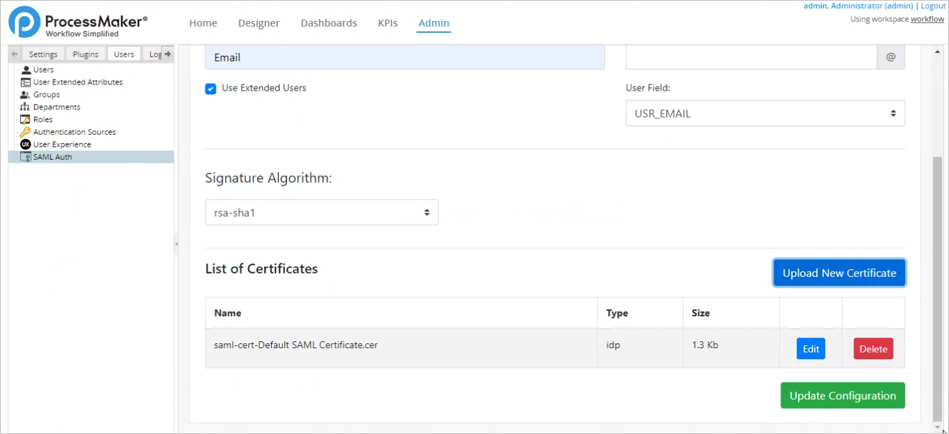 In ProcessMaker Configurations tab, click Upload New Certificate and then click Browse.