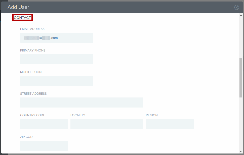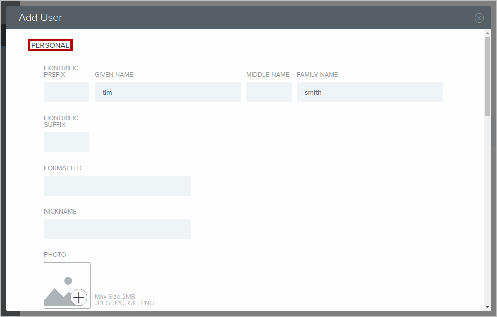 In the Add User pop-up screen, complete all sections with the new user personal data required.