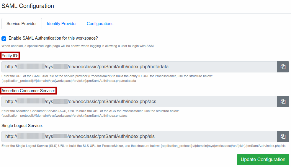 Copy the following fields from PingOne to ProcessMaker in the Identity Provider section, then click Update Configuration: