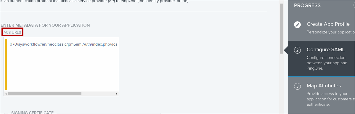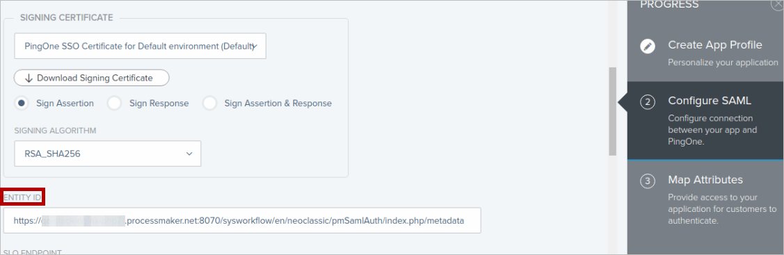 Copy the following values from ProcessMaker Service Provider section (first image below) to the Configure SAML step in PingOne: