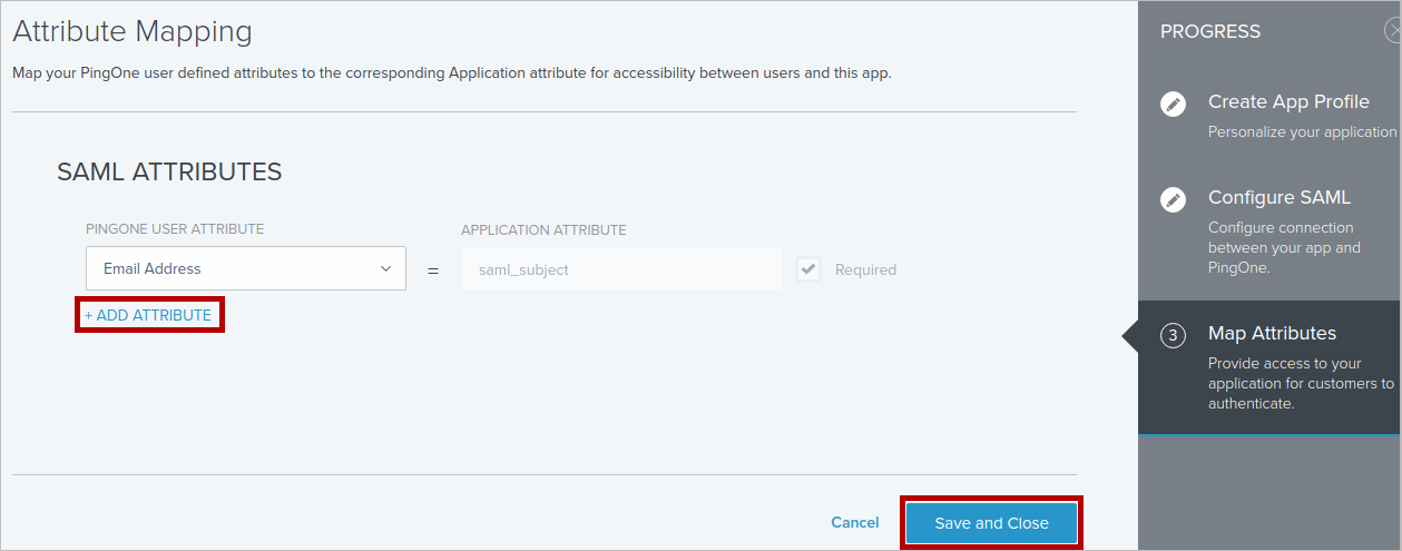 In the Attribute Mapping step, add the attributes that will match ProcessMaker users. Then click Save and then Close.
