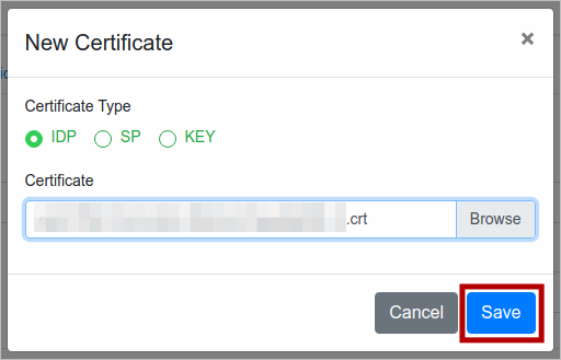 Select IDP as the Certificate Type, browse and then select the downloaded Certificate file. Click Save.