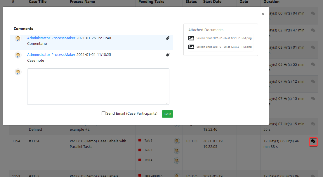 . When the user clicks on this icon, it displays a modal window with a list of all the case notes and attached documents. It is also possible to add new comments and option to send these new comments as emails to the case participants.