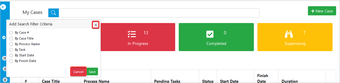 Started by Me: It filters all the cases started by the user and the Pending Tasks can be organized by the following statuses: