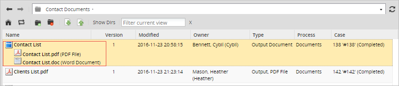 In the case of Output Documents, if the file was configured to be generated in both .doc and .pdf formats, the Download button won't be enabled and a different icon will be assigned. Double click on the file to display the available format: