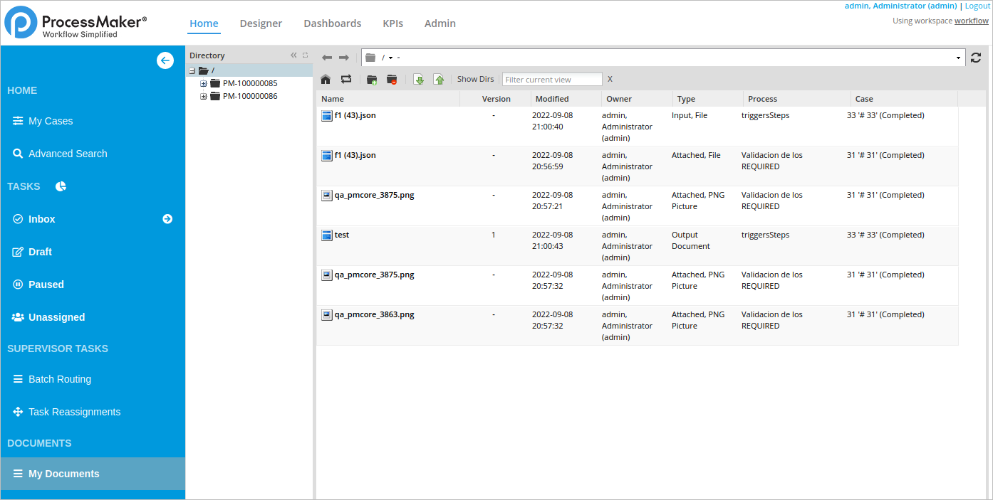 Only users, such as admin, with the PM_FOLDERS_VIEW permission in their role have access to this new option. Then, it is not necessary to provide users with a process permission to have access to the files during the execution of a process. All generated or uploaded files within a process are stored in this section.