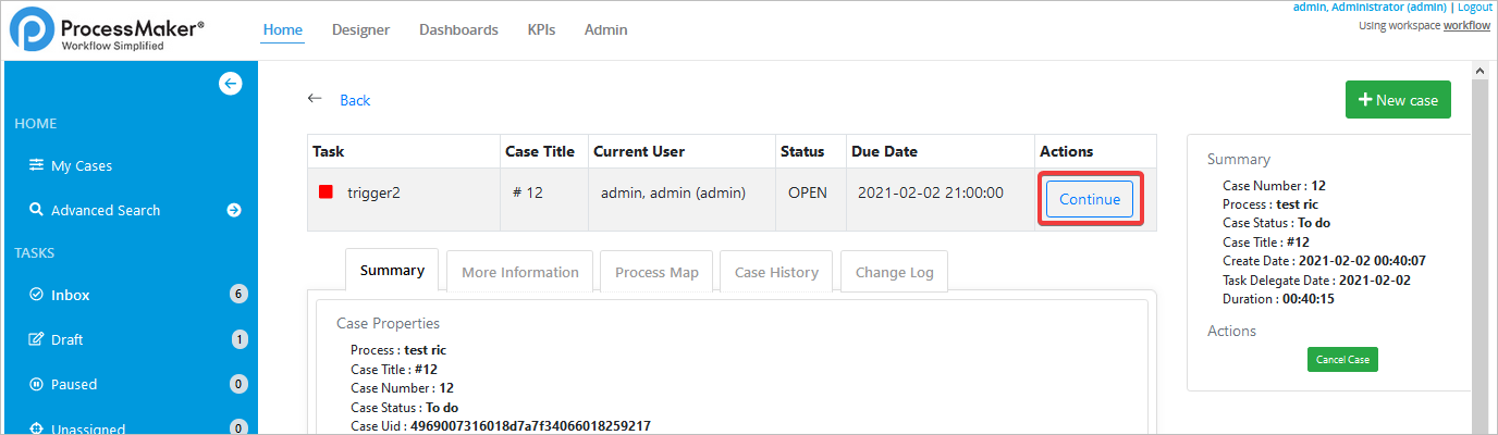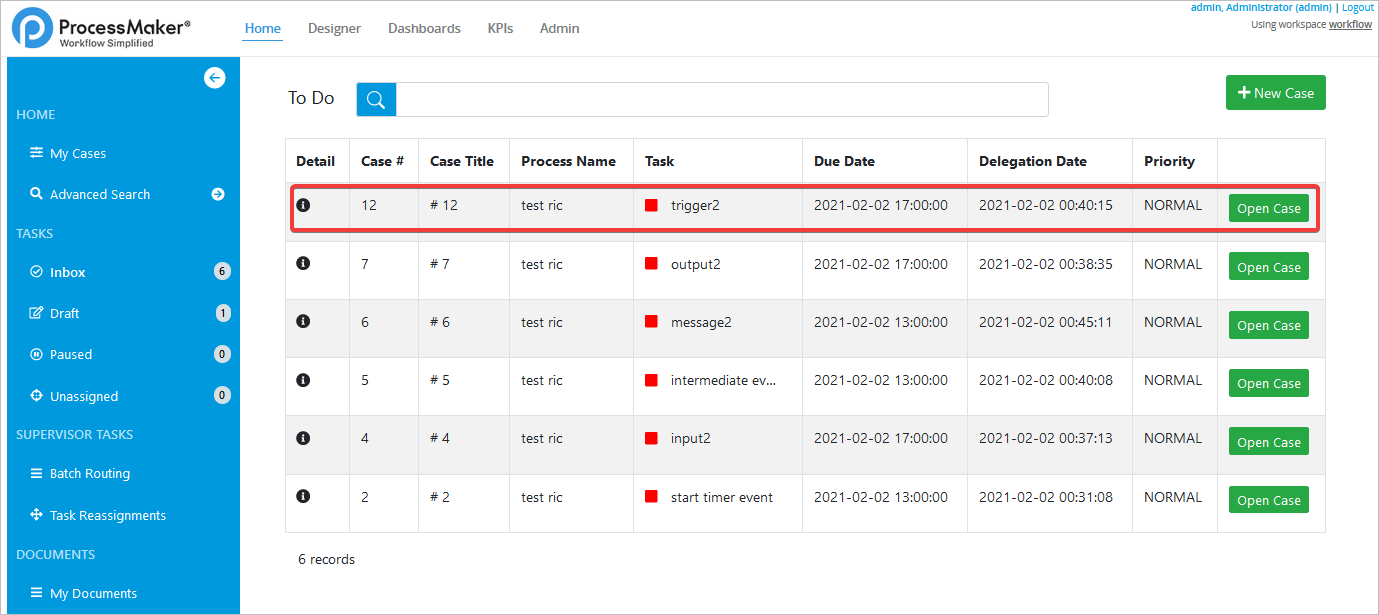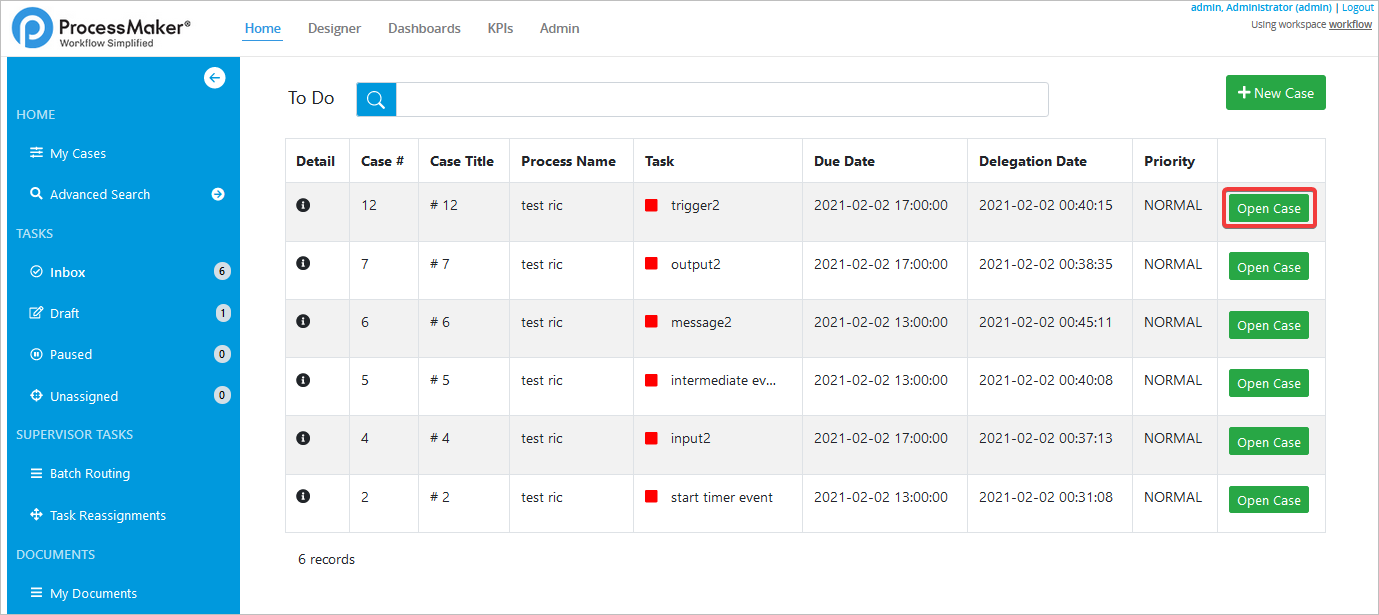 27 Using the open case link. The inbox tray will be displayed listing all the parallel tasks assigned to the user filtered by the case number. The user must select a task to open.