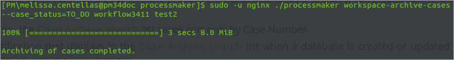 sudo -u nginx ./processmaker workspace-archive-cases [workspace_name] [data_base_name] Where: