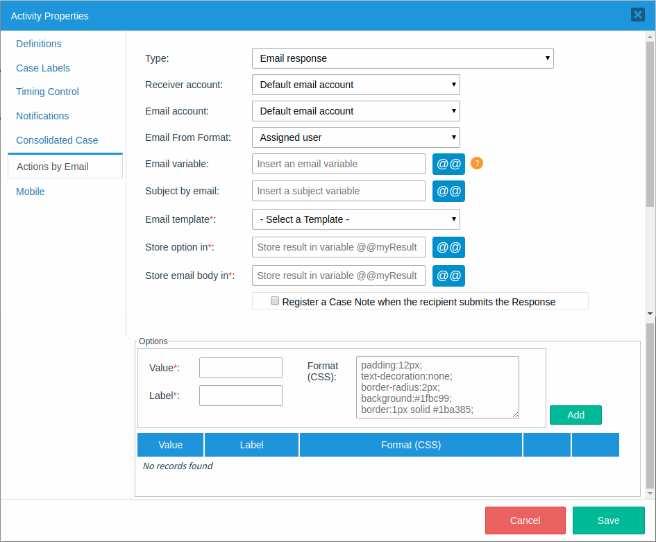 In the Options group, add the options that will be sent to the users in the email. Each option added must have a value, which will be stored in the previous selected variable after users select one option and send the response. Each option must also have a label that will be shown to the user and can be customized with CSS code so it is easier for users to identify each option in the email.