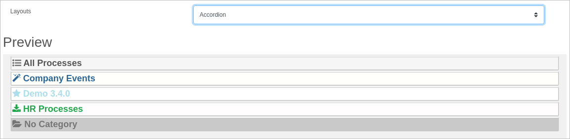 • Accordion: Select Accordion to display categories in a list that expands to show its associated processes.