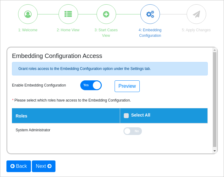 1. Toggle the Enable Embedding Configuration option so that it reads Yes. When the Enable Embedding Configuration option is enabled, optionally click the Preview button to preview the Embedding Configuration view when the configuration is completed.