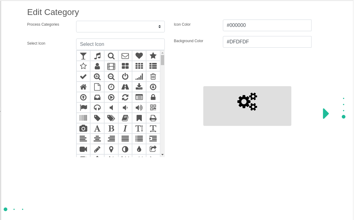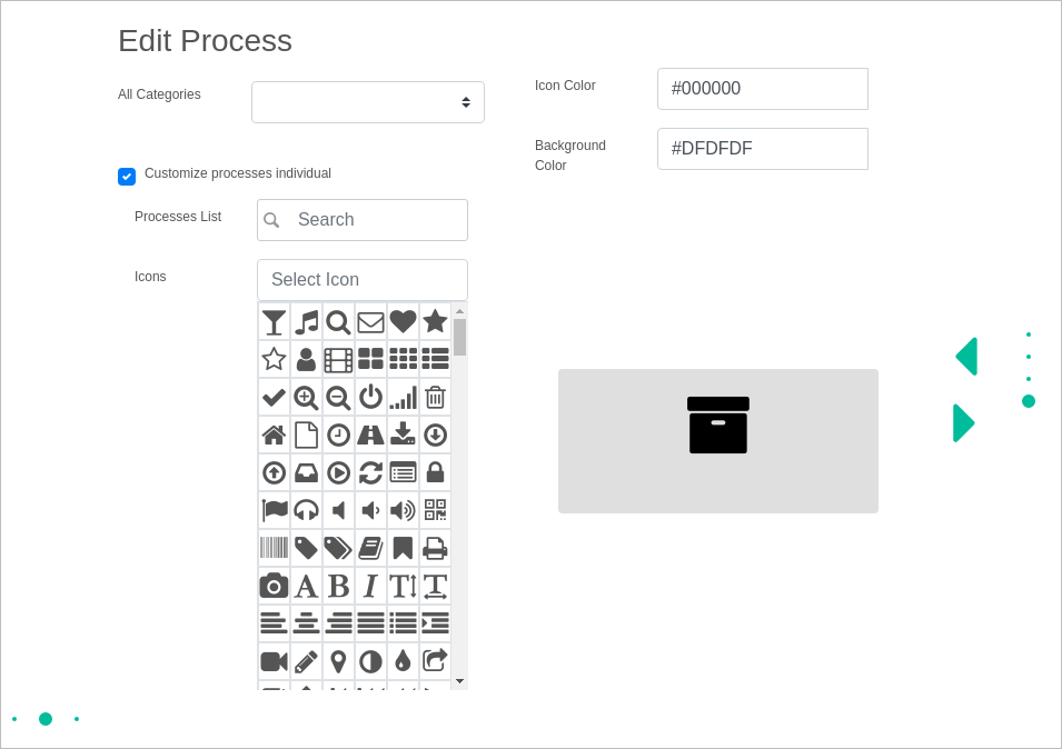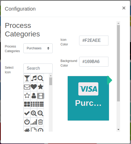 You can change the icons and colors of the categories and processes by clicking the Configuration icon. This opens an interface where you can do all the changes.