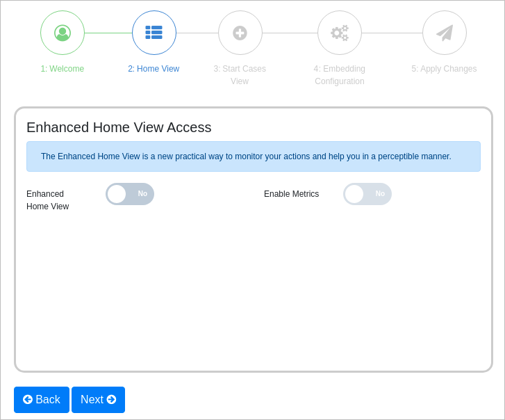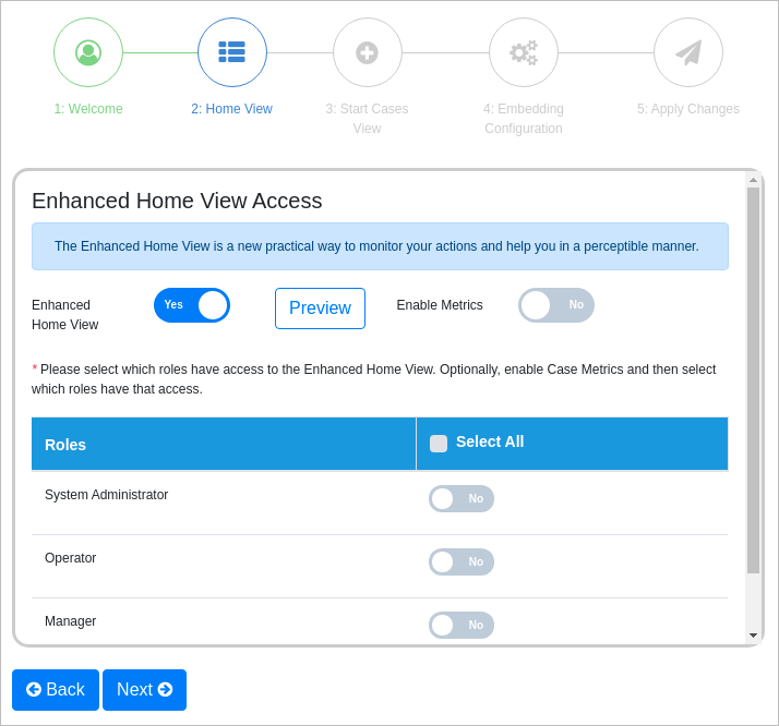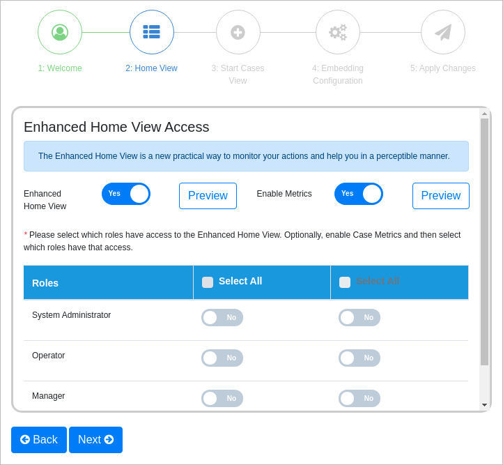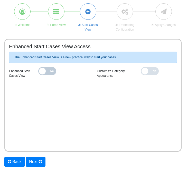 1. Toggle the Enhanced Start Cases View option so that it reads Yes. When the Enhanced Start Cases View option is enabled, optionally click the Preview button to preview the new Home view when the configuration is completed.