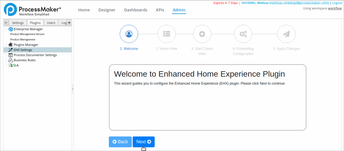1. Go to Admin > Plugins and click the EHX Settings option. The Welcome to the Enhanced Home Experience Plugin screen displays.