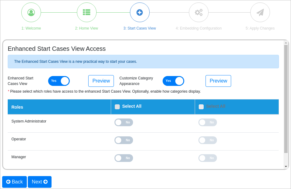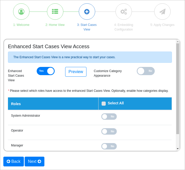 3. Optionally, click the Customize Category Appearance to customize how categories display in this view. When the Customize Category Appearance option is enabled, optionally click the Preview button to preview how categories would display when the configuration is completed. Select which ProcessMaker role(s) have access to customize how categories display by toggling each role so the toggle key reads Yes. By default, all toggle keys read No, meaning no role has access to customize how categories display for the new Start Cases view. Click the Select All checkbox to grant all ProcessMaker roles access to customize how categories display for the new view.