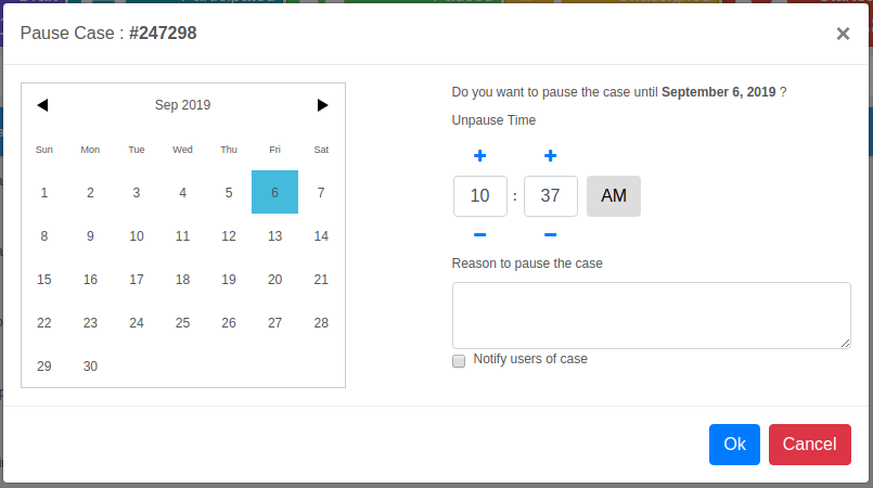 Click Ok to save the changes and pause the case or click Cancel to exit.